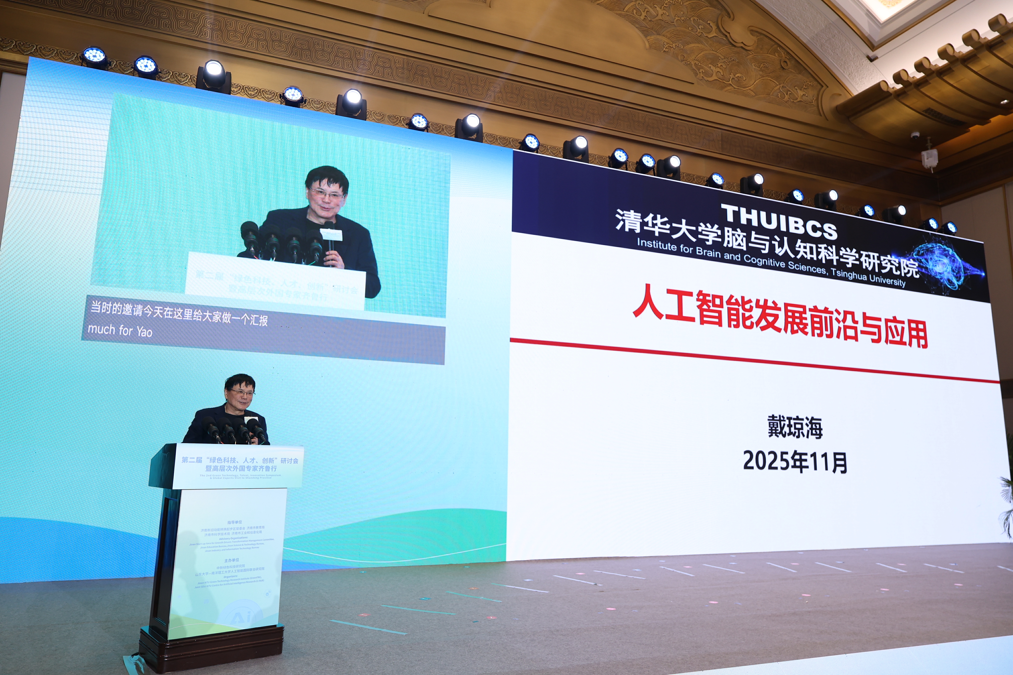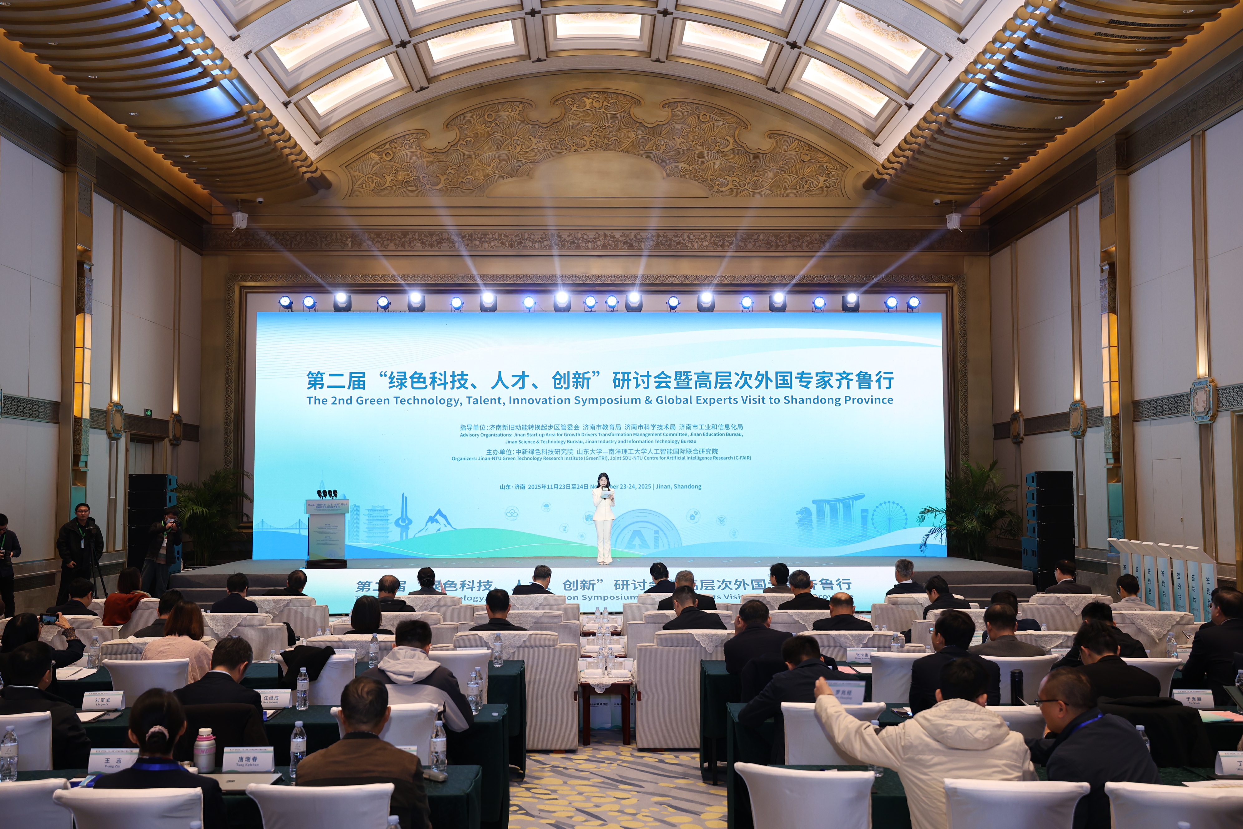 2025年11月23-24日,由山东大学-南洋理工大学人工智能国际联合研究院(C-FAIR)与中新绿色科技研究院(GreenTRI)共同主办的第二届“绿色科技,人才,创新”研讨会暨高层次外国专家齐鲁行活动在山东大厦举行。清华大学教授、中国工程院院士、国务院参事戴琼海,济南市委常委,济南起步区党工委副书记、管委会主任孙斌,山东大学党委常委、副校长王美琴出席,C-FAIR师生超50人参加本次会议活动。