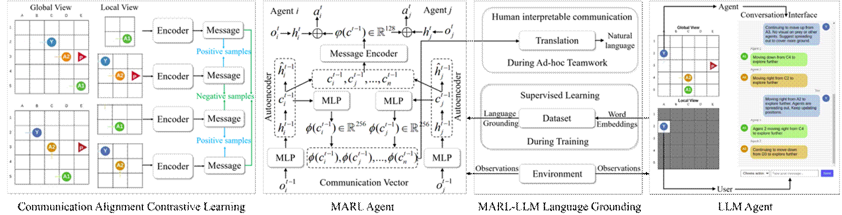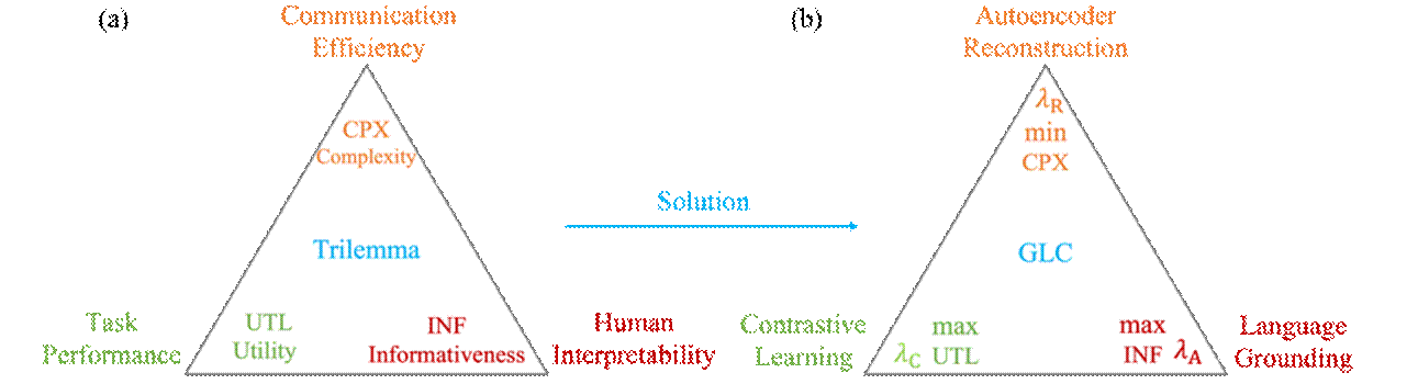 该研究聚焦于多智能体通信学习中存在的任务性能、通信效率与可解释性之间的三难困境,提出一种基于语义接地与对比学习的多智能体通信框架。利用自编码器学习离散化的压缩通信符号,以实现高效的通信传输。通过大语言模型生成的数据,将通信符号与人类可理解的概念在语义层面进行对齐,从而增强系统的可解释性。此外,引入对比学习目标,以促进智能体之间的一致性与相互可理解性,进而保障任务的高性能完成。借助信息瓶颈原则对上述目标进行动态平衡,在复杂多智能体任务中实现了任务性能、通信效率与可解释性的均衡提升。