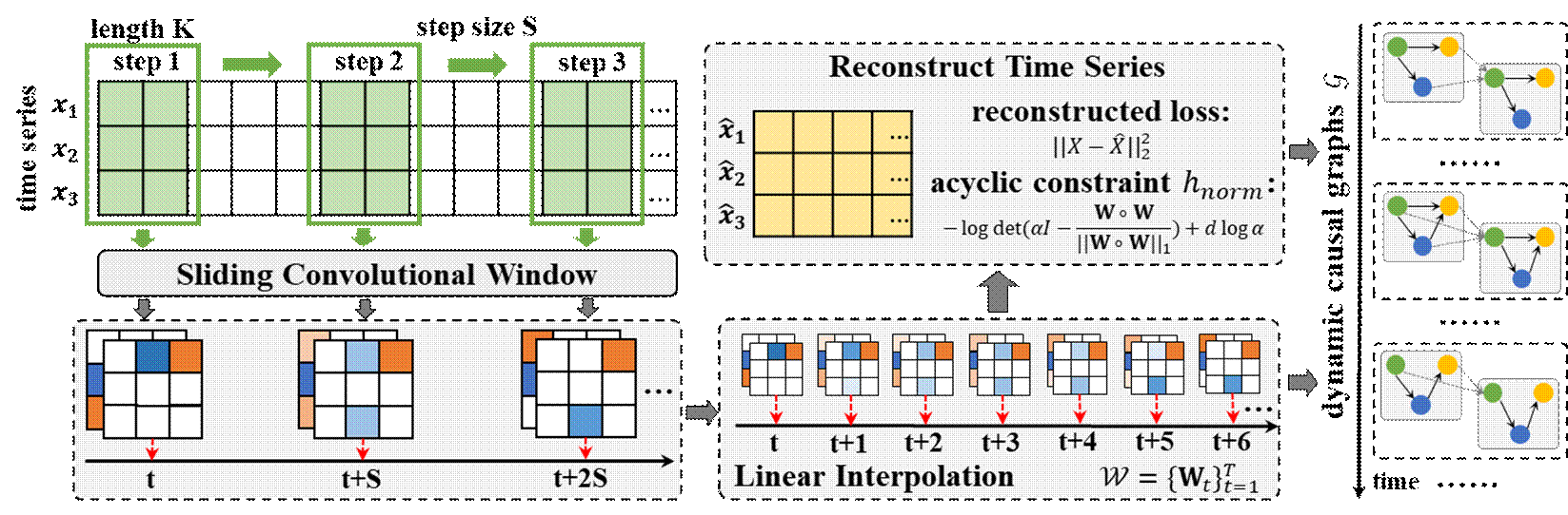 该算法针对现实场景中的复杂因果关系非稳态且难以识别的问题,提出一个完全动态的因果结构学习框架,利用卷积网络来捕捉粗粒度时间窗口内的因果模式,然后在每个时间步应用线性插值来细化因果结构,从而恢复细粒度且随时间变化的因果图。算法还提出一个基于矩阵范数缩放的无环约束,在提高效率的同时有效地约束了不断演变的因果结构中的循环。