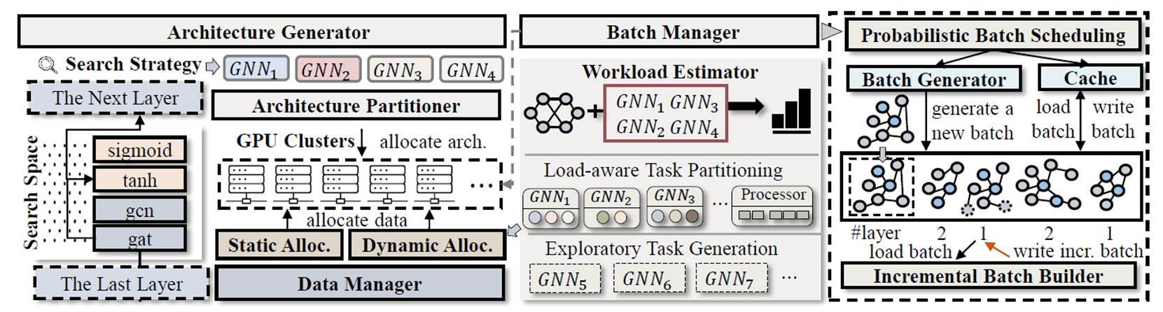 该工作面向图神经网络结构搜索(Graph Neural Architecture Search, GNAS)这一新兴的自动化机器学习任务,聚焦其在多GPU环境下普遍存在的高计算负载和强数据密集型等关键挑战。GNAS需要对大量候选图神经网络(GNN)结构进行反复训练和评估,容易造成巨大的数据访问冗余和同步开销,现有多GPU方案通常仅采用数据并行或架构并行:前者在多卡同步上成本高昂,后者在大规模数据集上难以扩展。